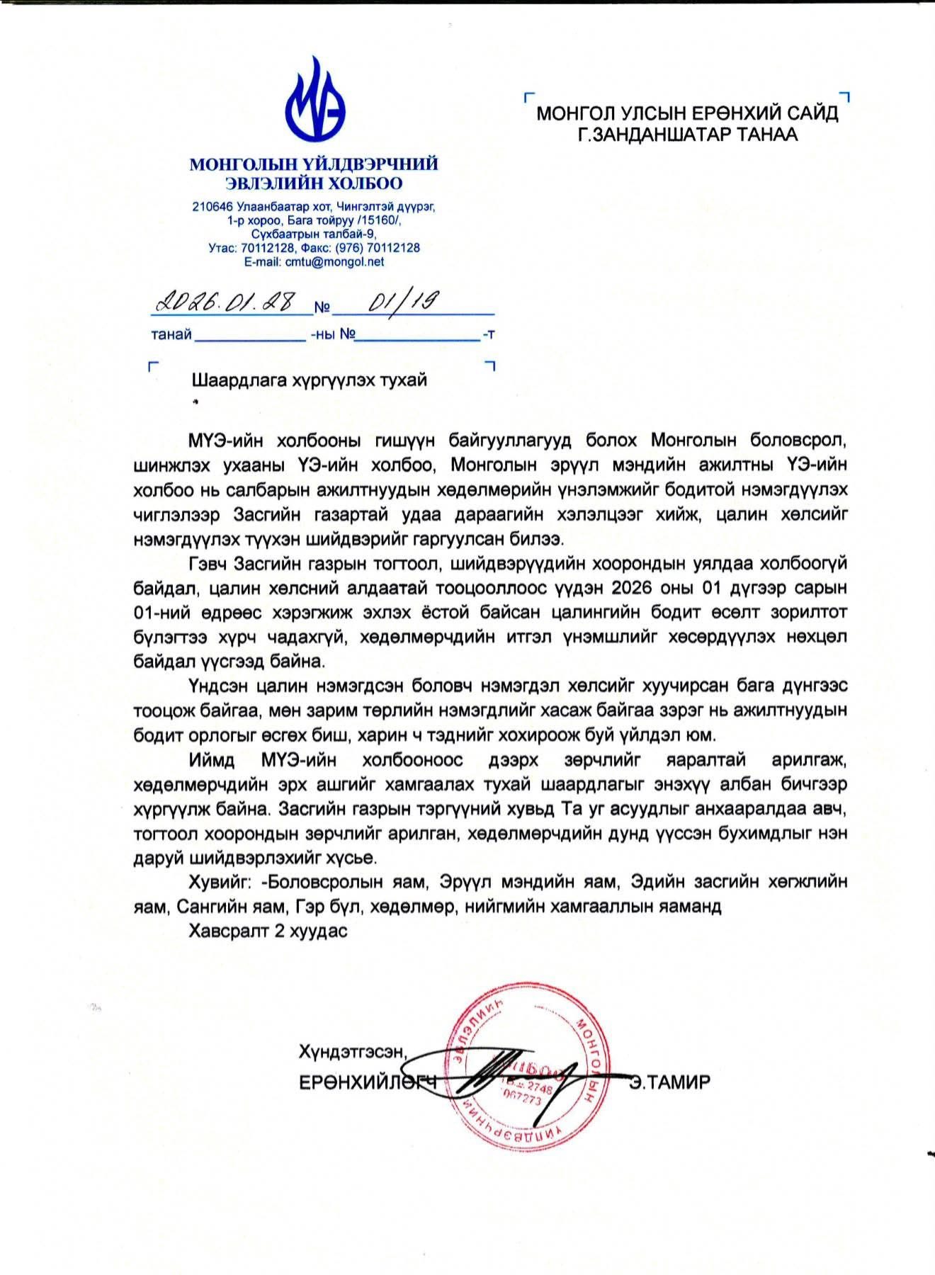 Шаардлагыг тодруулбал, МҮЭ-ийн холбооны гишүүн байгууллагууд болох Монголын Боловсрол, шинжлэх ухааны ҮЭ-ийн холбоо, Монголын Эрүүл мэндийн ажилтны ҮЭ-ийн холбоод нь салбарын ажилтнуудын хөдөлмөрийн үнэлэмжийг бодитой нэмэгдүүлэх чиглэлээр Засгийн газартай удаа дараа хэлэлцээ хийж, үндсэн цалинг нэмэгдүүлэх тухай шийдвэрт хүрсэн билээ.