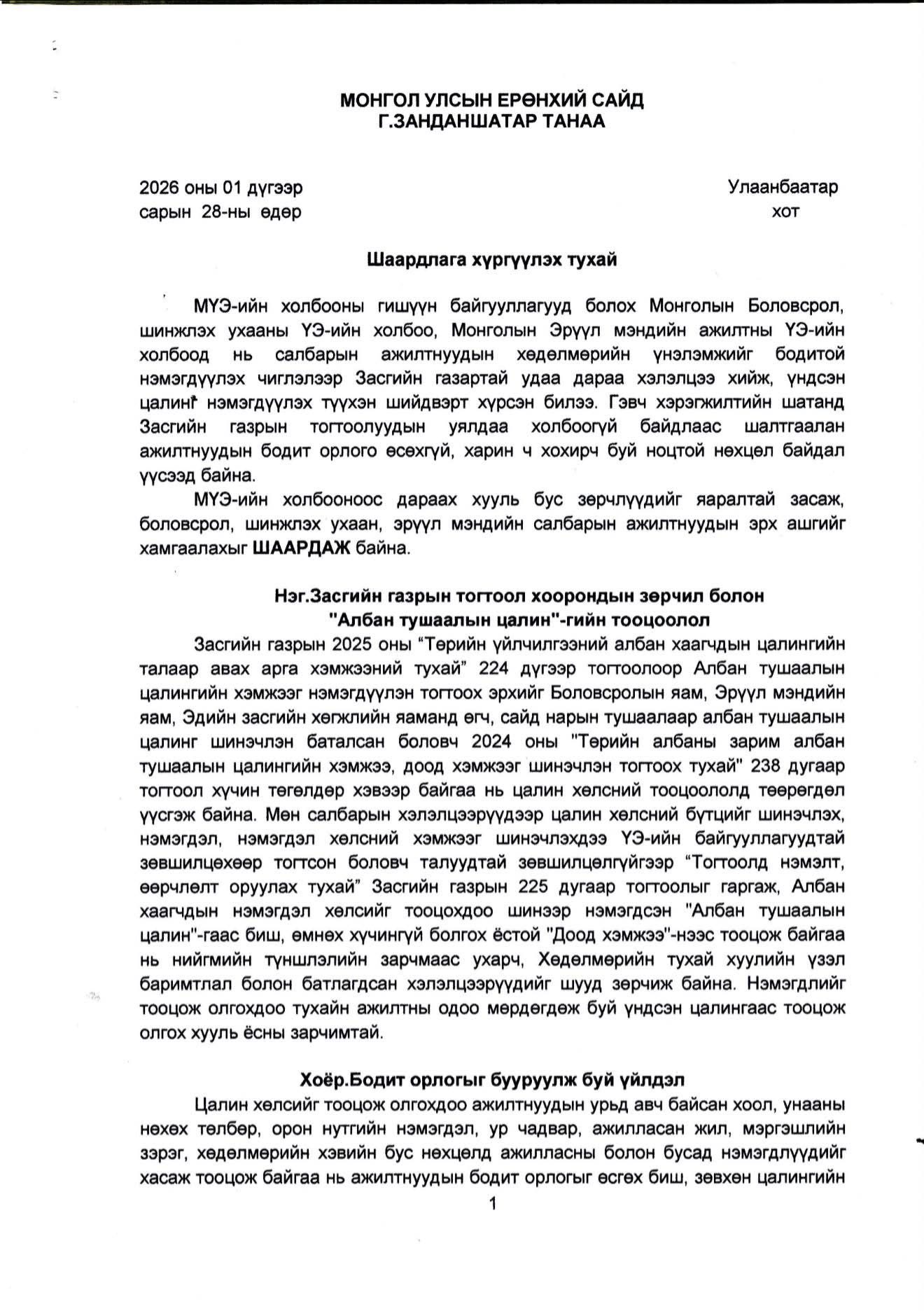 Багш, эмч нарын цалингийн нэмэгдэл, цалин олгох системийг шинэчлэхтэй холбоотой шаардлагыг Ерөнхий сайд Г.Занданшатарт хүргүүлжээ.