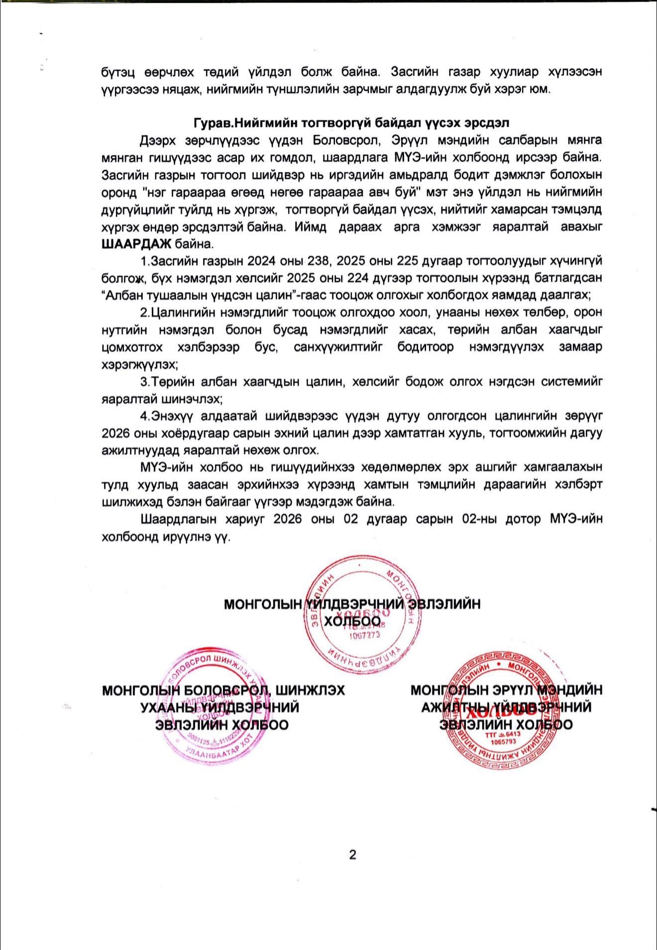 МҮЭ-ийн холбооноос дараах хууль бус зөрчлүүдийг яаралтай засаж, боловсрол, шинжлэх ухаан, эрүүл мэндийн салбарын ажилтнуудын эрх ашгийг хамгаалахыг шаардаж байна гэжээ.