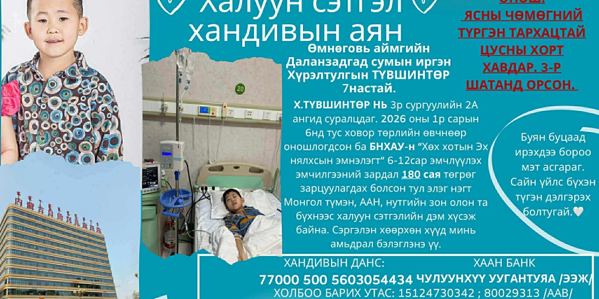 Х.Түвшинтөр хүү нь 2026 оны нэгдүгээр сарын 6-нд ясны чөмгөний түргэн тархацтай цусны хорт хавдрын 3-р шат хэмээх онош тогтоогдож, БНХАУ-ын Хөх хотын “Эх нялхсын” эмнэлэгт 6-12 сарын эмчилгээний зардал болох 180 сая төгрөг шаардлагатай болсон тул элэг нэгт ард түмнээсээ тусламж хүслээ.
