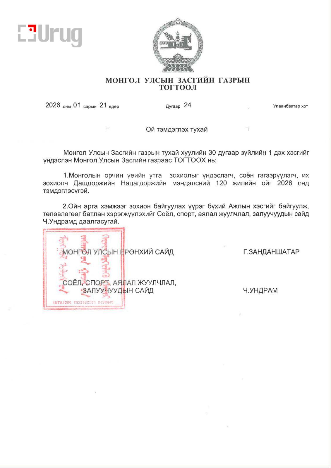 Их зохиолчийн Монголын соёл, утга зохиолын түүхэнд гүйцэтгэсэн үүрэг, оруулсан хувь нэмрийг олон нийт, ялангуяа залуу хойч үед сурталчлан таниулах зорилгоор “Ой тэмдэглэх тухай” Засгийн газрын тогтоолын төслийг боловсруулж, 2026 оны 1 дүгээр сарын 21-ний өдрийн Засгийн газрын хуралдаанаар хэлэлцүүлэн батлууллаа.