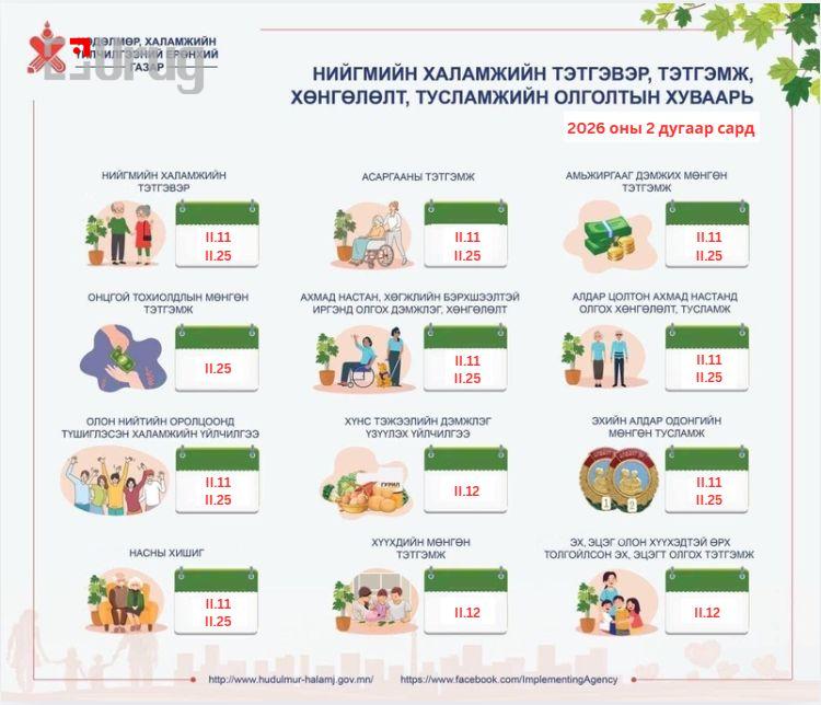 Хөдөлмөр, халамжийн үйлчилгээний ерөнхий газар энэ сард олгох тэтгэмж, халамжийн хуваарийг танилцуулжээ.