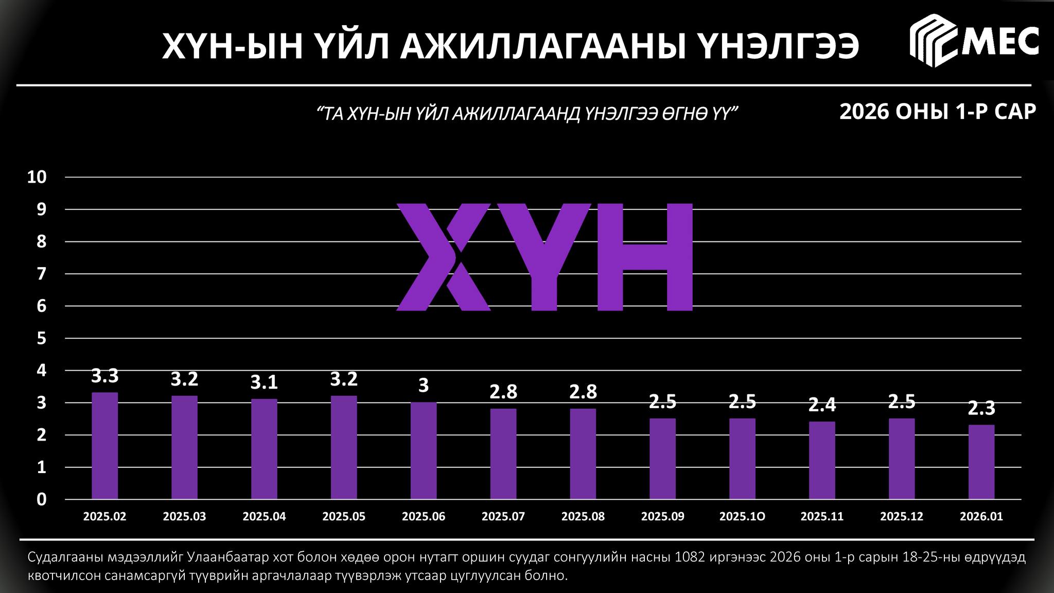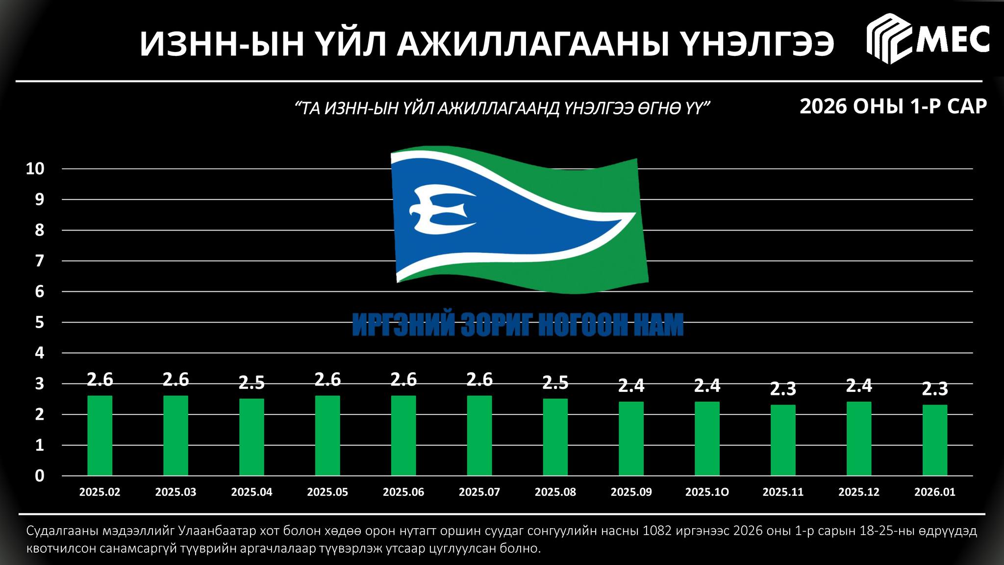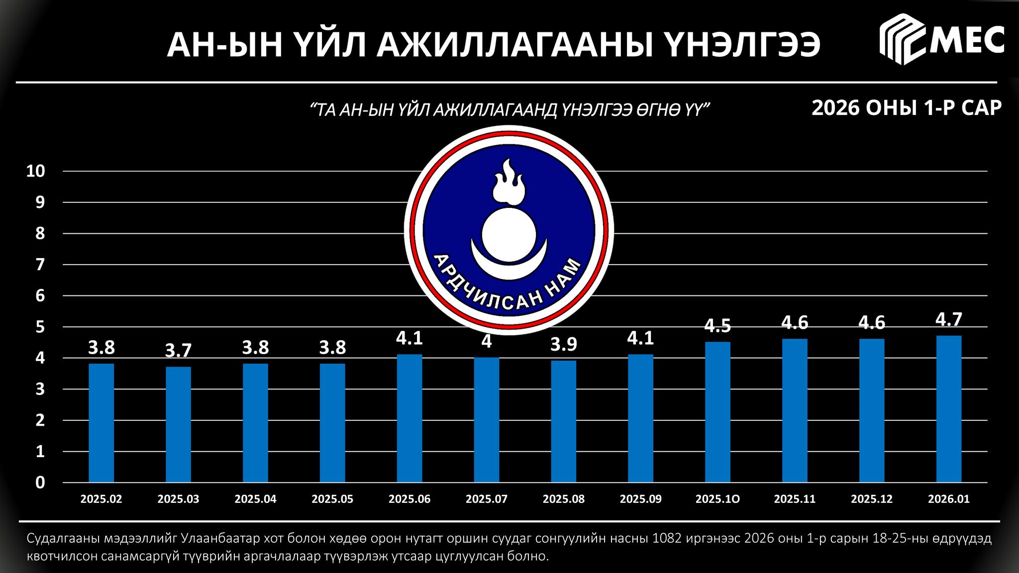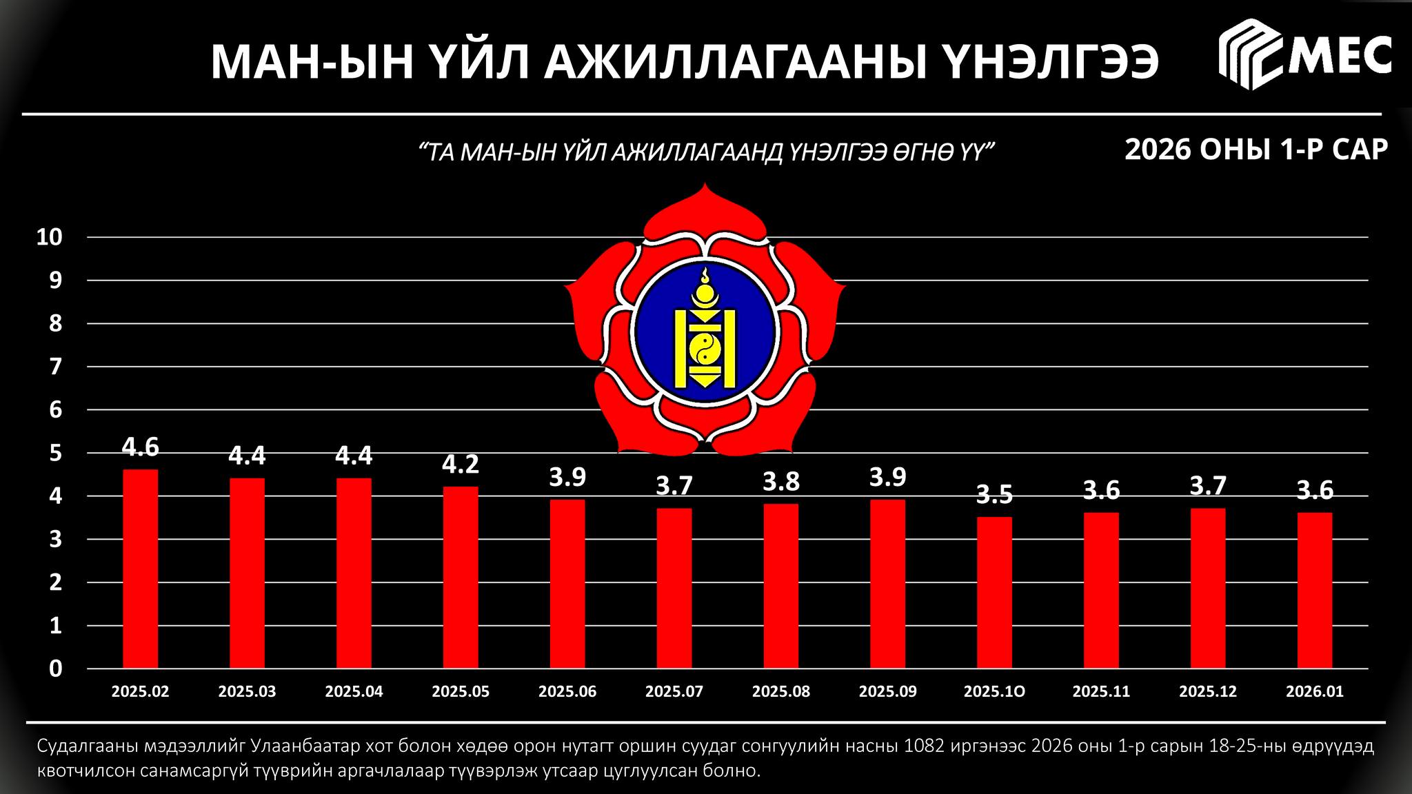 MEC судалгааны төв улс төрийн намын үйл ажиллагаанд өгч буй иргэдийн үнэлэмжид сар бүр тандалт хийж, үр дүнг танилцуулдаг. Энэ хүрээнд тус байгууллага 2026 оны нэгдүгээр сарын 18-25-ны өдрүүдэд квотчилсон санамсаргүй түүврийн аргачлалаар түүвэрлэж Улаанбаатар хот болон хөдөө орон нутагт оршин суудаг сонгуулийн насны 1082 иргэнээс судалгаа авчээ.
