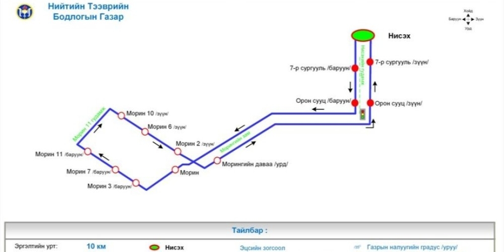Тус зогсоолд Ч:67 “Морингийн даваа – Нисэх” чиглэлийн нийтийн тээврийн автобус зогсох юм. Дээрх замналын өөрчлөлтийг маргааш буюу хоёрдугаар сарын 11-ний өдрөөс мөрдөж эхэлнэ.