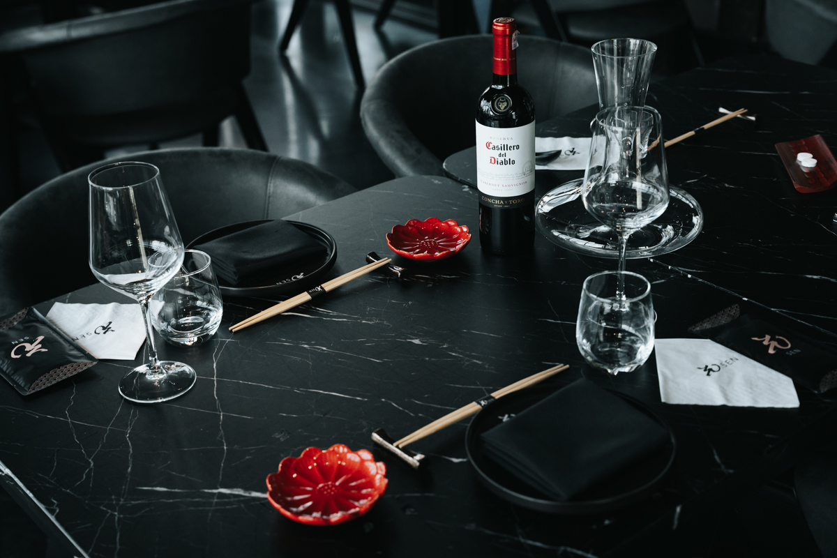 Зураг дээрх Casillero del Diablo Chardonnay-ийн жимслэг хөнгөн амт нь тус сетний гол хоол болох сашимитай төгс зохицдог. Харин Casillero del Diablo Cabernet sauvignon нь хуурай боловч илүү жимслэг амттай тул стэйктэй илүү зохицно.