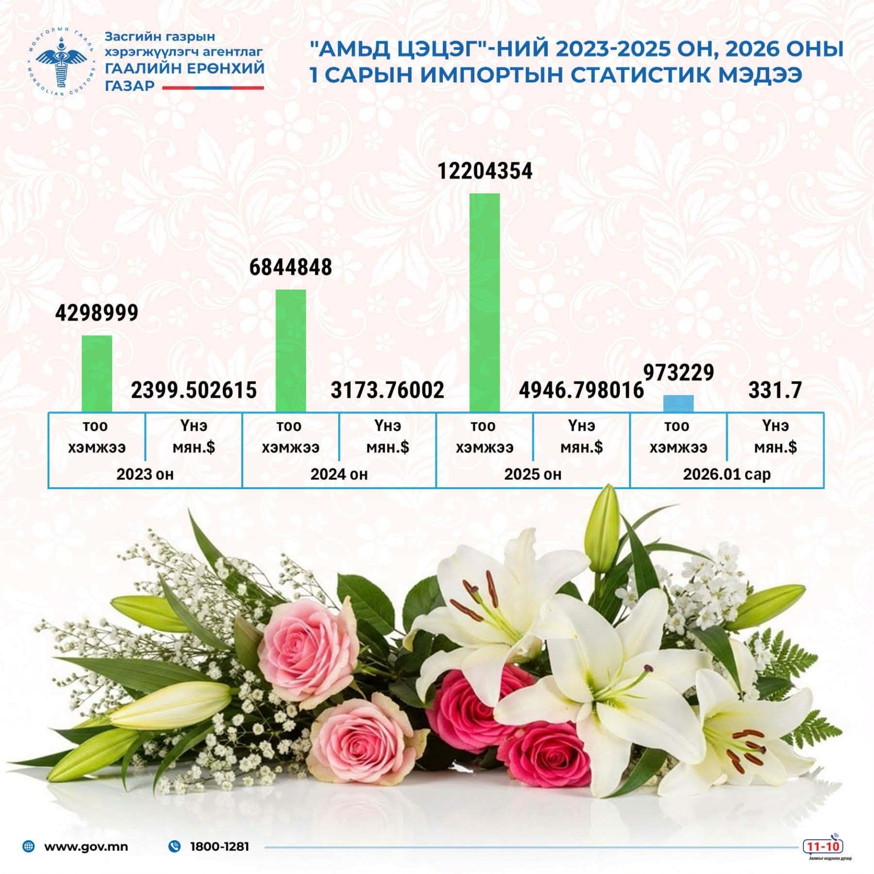2026 оны эхний 1 сард 973,229 ширхэг амьд цэцэг импортолжээ.