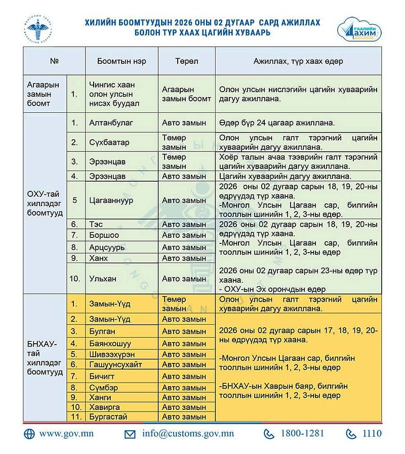 Сар шинийн баярын өдрүүдэд хилийн боомтууд дараах хуваарийн дагуу ажиллана. Тодруулбал, БНХАУ-тай хиллэдэг Булган, Баянхошуу, Шивээхүрэн боомтууд хоёрдугаар сарын 17,18,19,20-ны өдрүүдэд түр хаана.