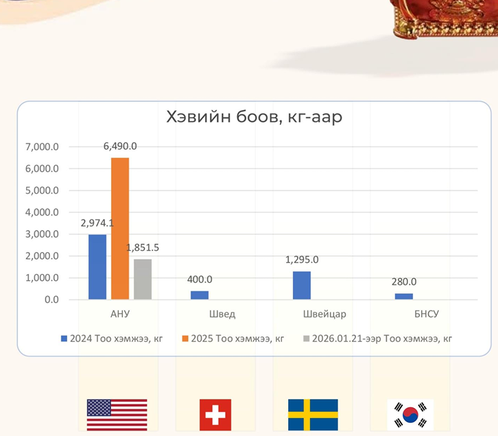 Манай улс 2024 онд Швед, Швейцар, БНСУ руу нийт 1975 кг хэвийн боов экспортолсон бол сүүлийн гурван жилд АНУ-руу тогтмол экспортолж байна. Харин 2025 онд Швед улс руу хийгдсэн еэвэнгийн экспортын хэмжээ хамгийн өндөр байна.