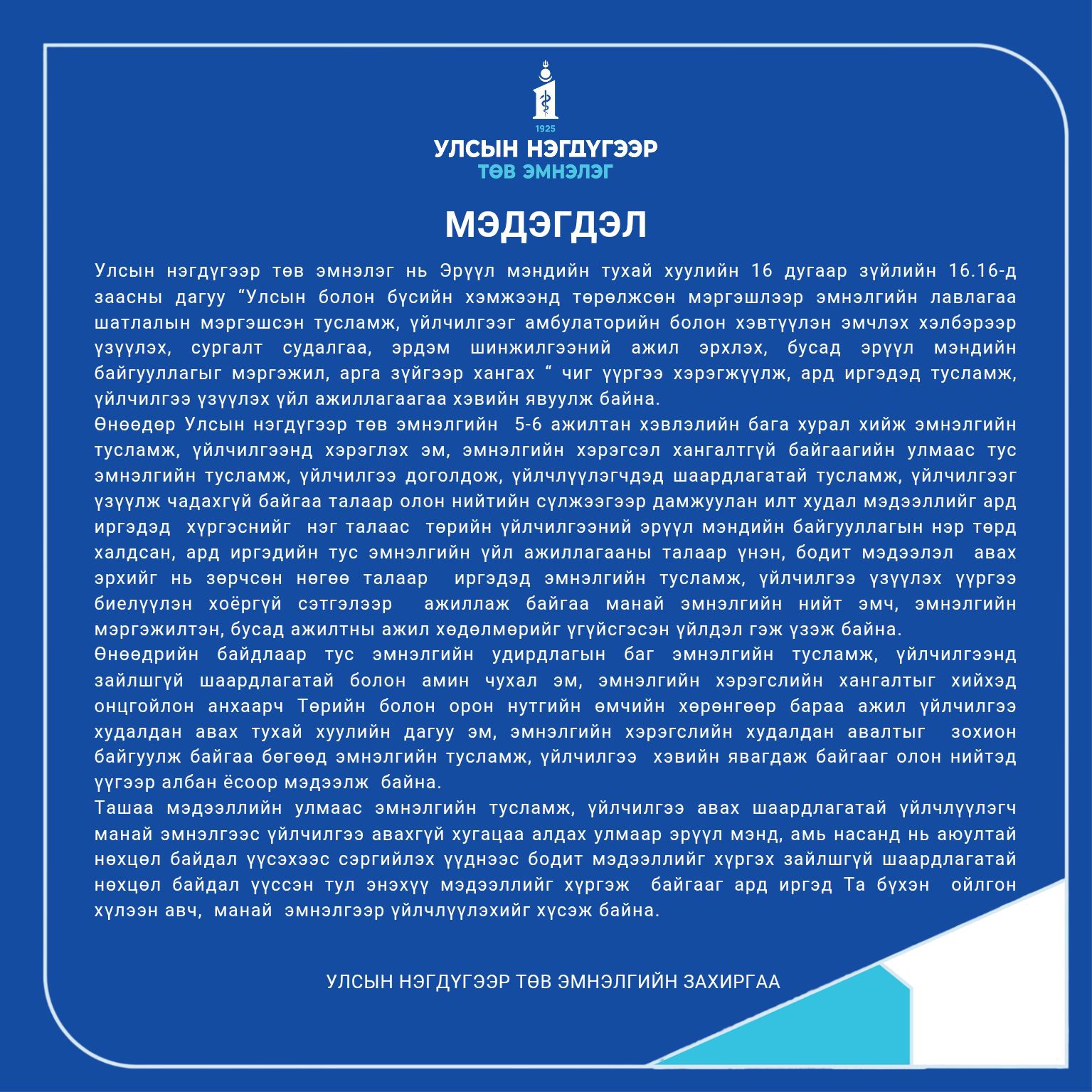 Энэ мэдээллийн араас тус эмнэлгийн пэйж хуудаснаа “Эмнэлэг хэвийн ажиллаж буй, тэд худал мэдээлэл тараалаа” гэх агуулга бүхий постер байрлуулжээ.
