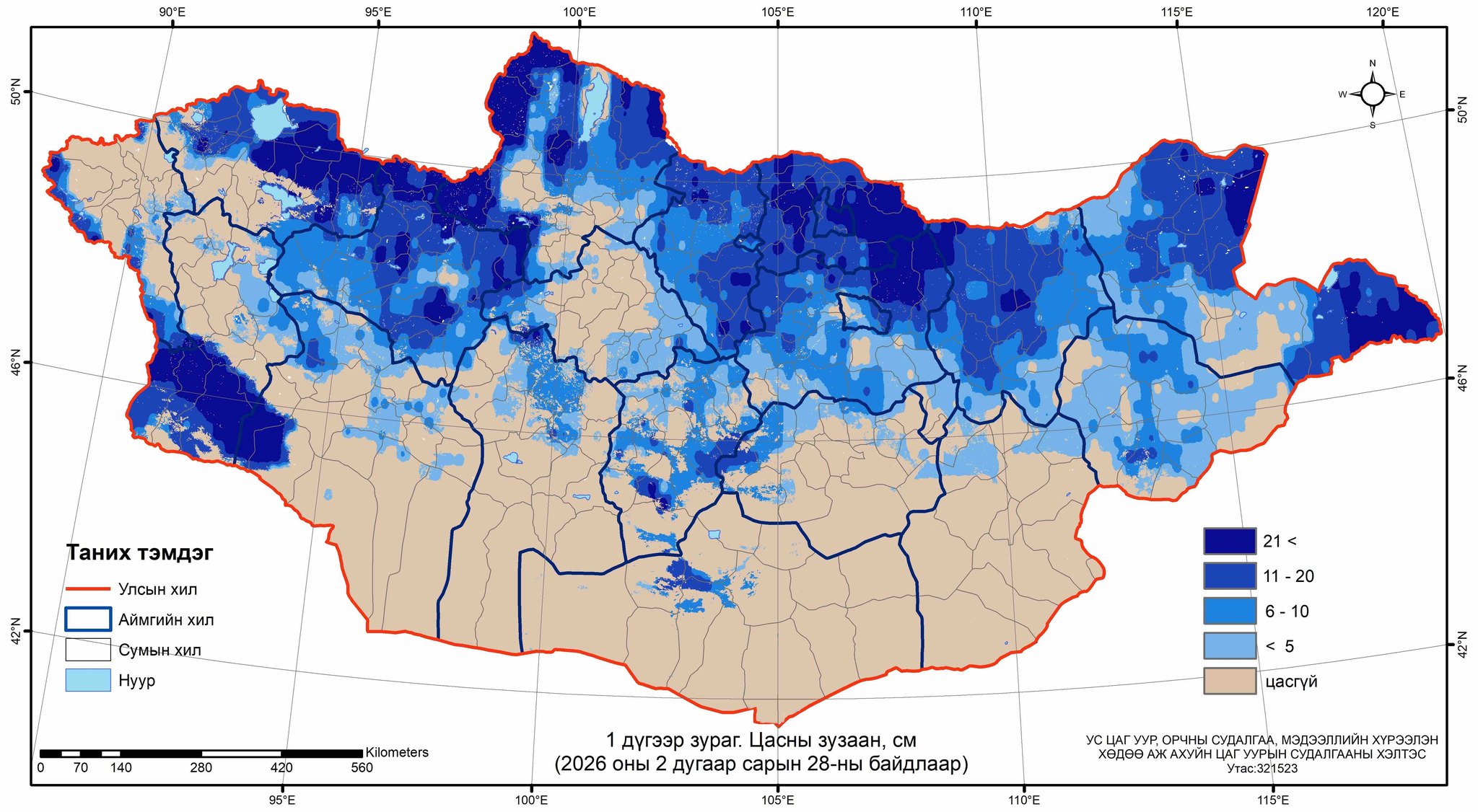 Ус цаг уур, орчны судалгаа, мэдээллийн хүрээлэнгээс гаргасан арав хоногийн сүүлийн өдөр хийдэг хээрийн цасны хэмжилтийн мэдээгээр хоёрдугаар сарын 28-ны байдлаар нийт нутгийн 65 хувьд цастай байна.