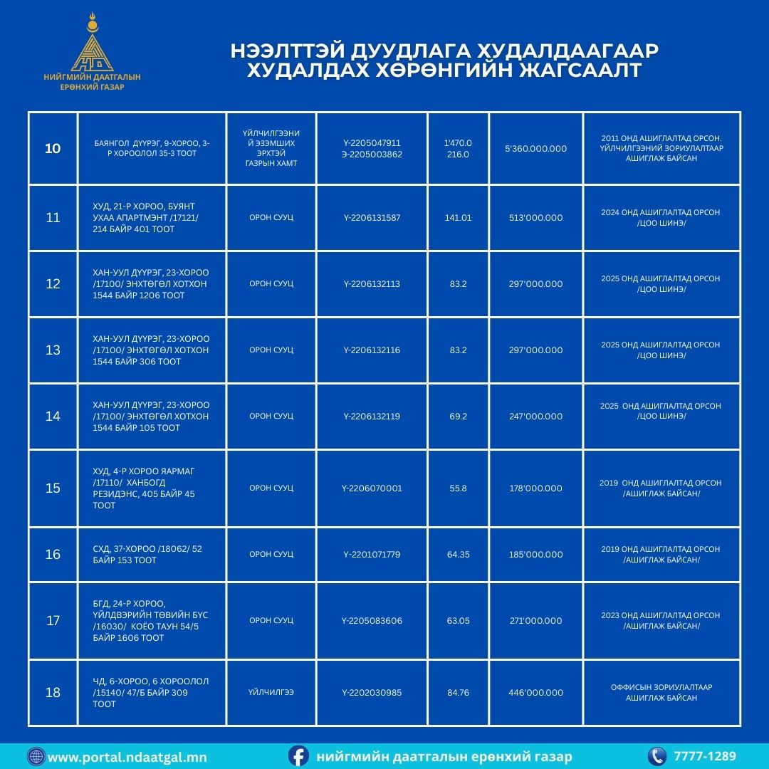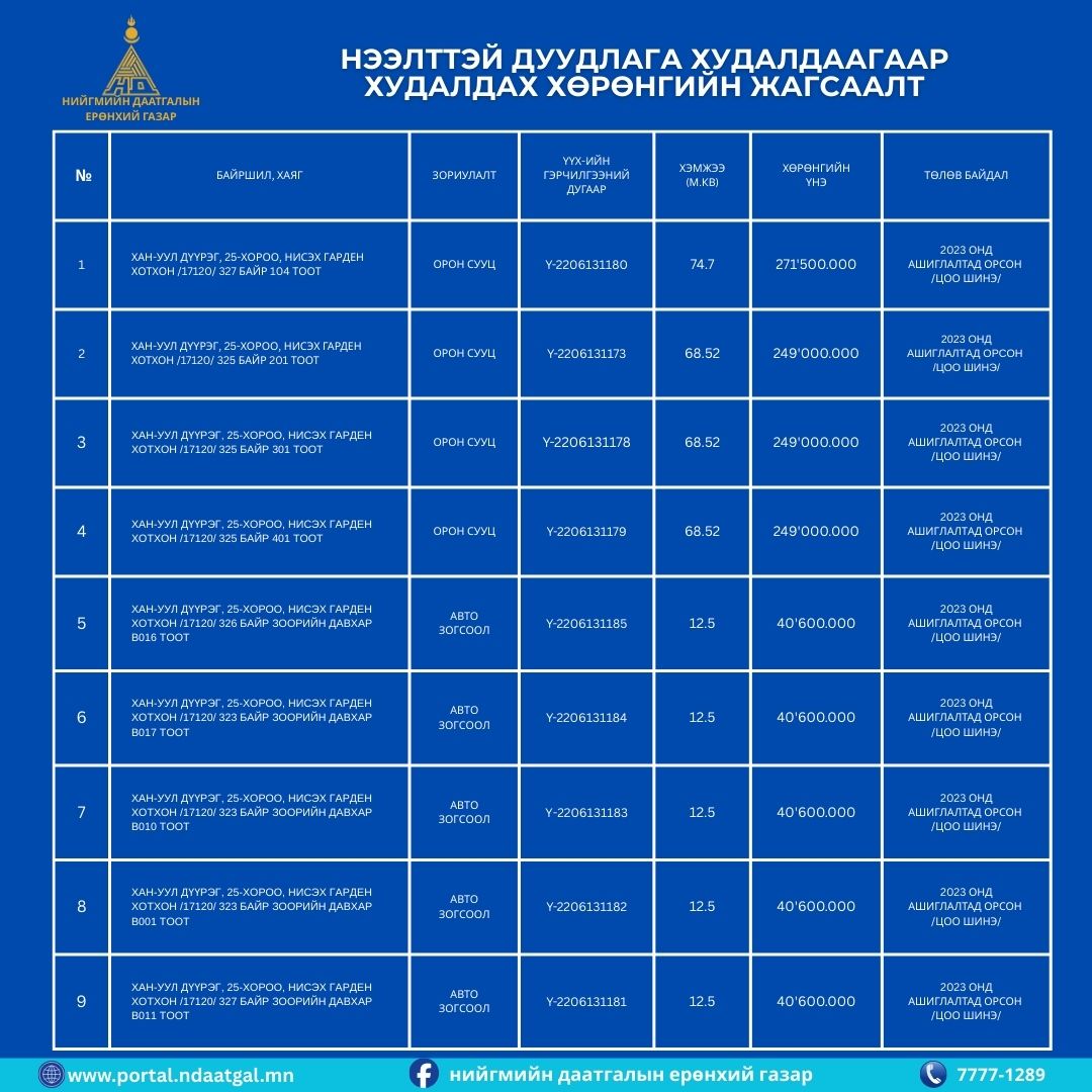 Та дараах хүснэгтээс дуудлага худалдаагаар зарах орон сууц, авто зогсоолуудын байршил, ашиглалтад орсон орсон он, дуудлага худалдаа эхлэх үнэ зэрэг мэдээллийг хараарай.