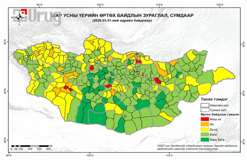 “Гамшгийн эрсдэлийн ерөнхий үнэлгээ хийх нэгдсэн удирдамж”-ийн дагуу 2026 оны хаврын шар усны үерийн аюул, өртөх байдал, эмзэг байдлын ерөнхий үнэлгээг хийжээ. Ерөнхий эрсдэлийн үнэлгээг холбогдох байгууллагуудын төлөөллөөс бүрдсэн ажлын хэсэг хамтран гүйцэтгэсэн байна. Эрсдэлийн үнэлгээний дүнгээр 21 аймгийн 330 сумыг хамруулан үнэлэхэд зургаан сум маш их, 20 сум их, 92 сум дунд, 212 сум бага буюу маш бага эрсдэлтэй гэж тогтоогдлоо. Харин нийслэлийн есөн дүүргийг үнэлэхэд Сонгинохайрхан дүүрэг маш их, дөрвөн дүүрэг дунд, дөрвөн дүүрэг бага буюу маш бага эрсдэлтэй гэж үнэлэгдсэн.