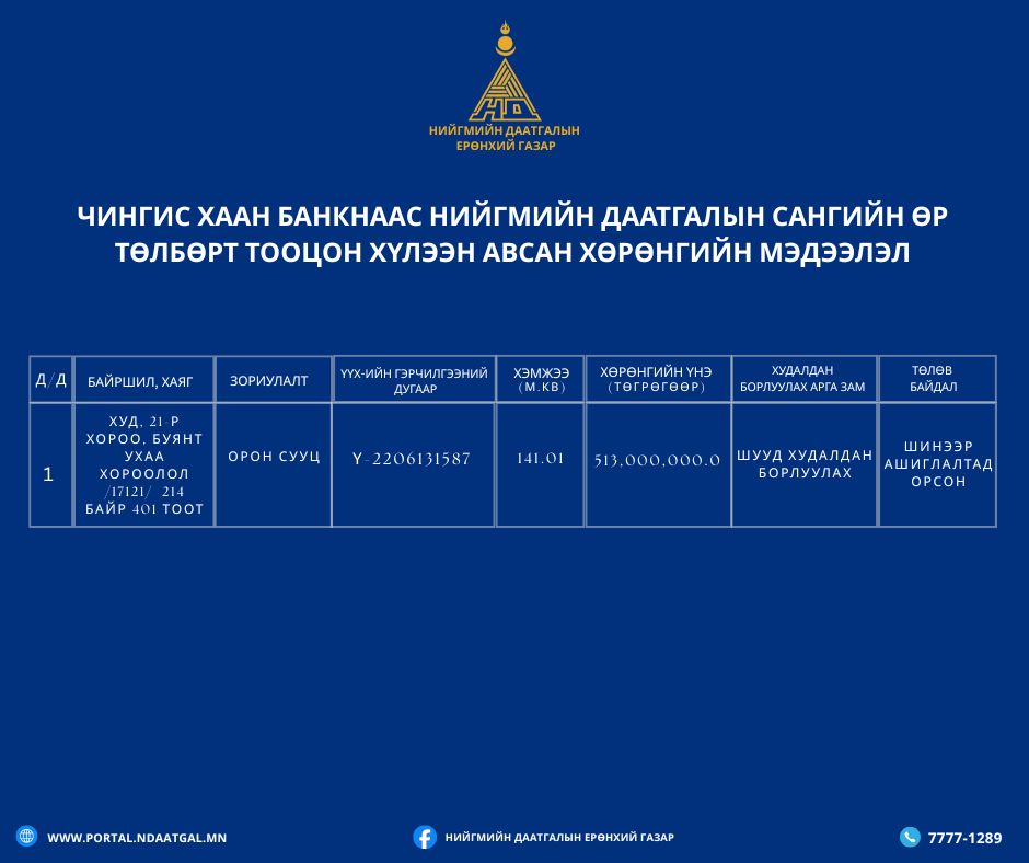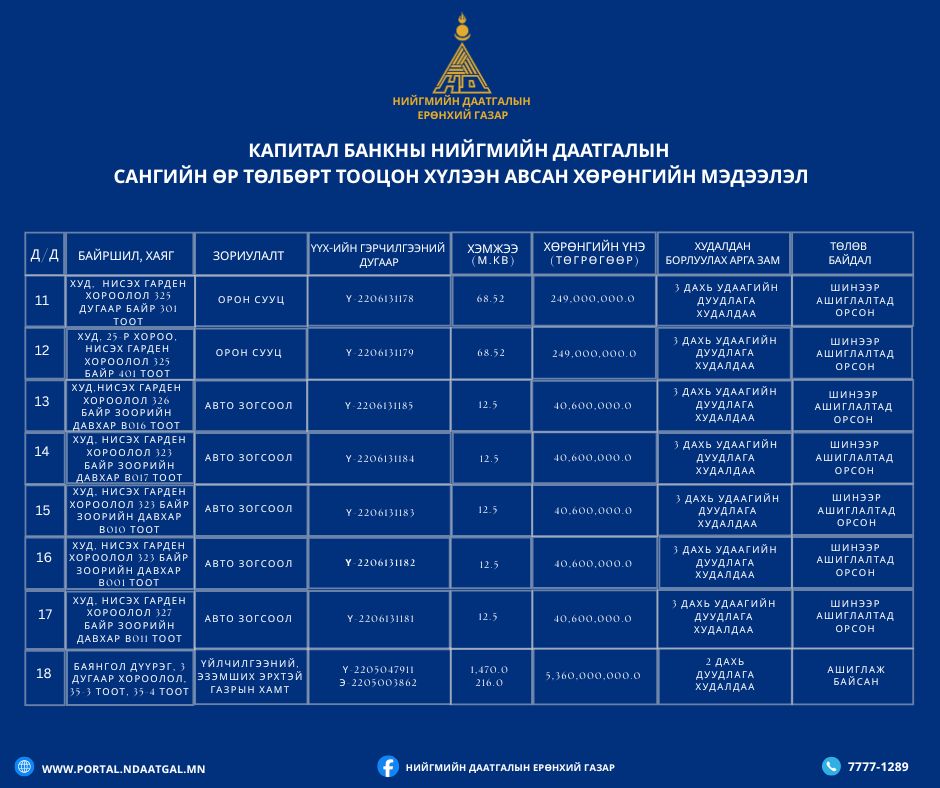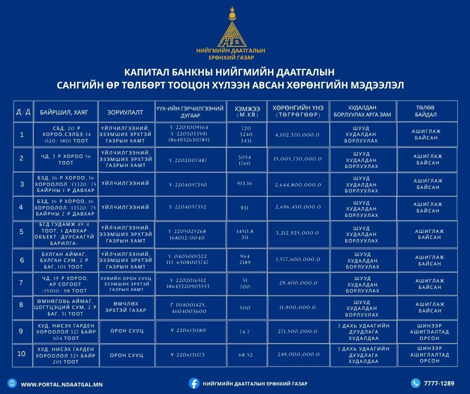 Капитал банк ХХК дахь Банкны эрх хүлээн авагч болон Чингис хаан банк ХХК-аас нэхэмжилсэн нийгмийн даатгалын сангийн өр төлбөрт тооцон шилжүүлэн авсан шууд худалдан борлуулах болон нээлттэй дуудлагын худалдаагаар худалдах боломжтой 19 байршилд байх үл хөдлөх хөрөнгийн мэдээллийг нээлттэй мэдээллэж байна.