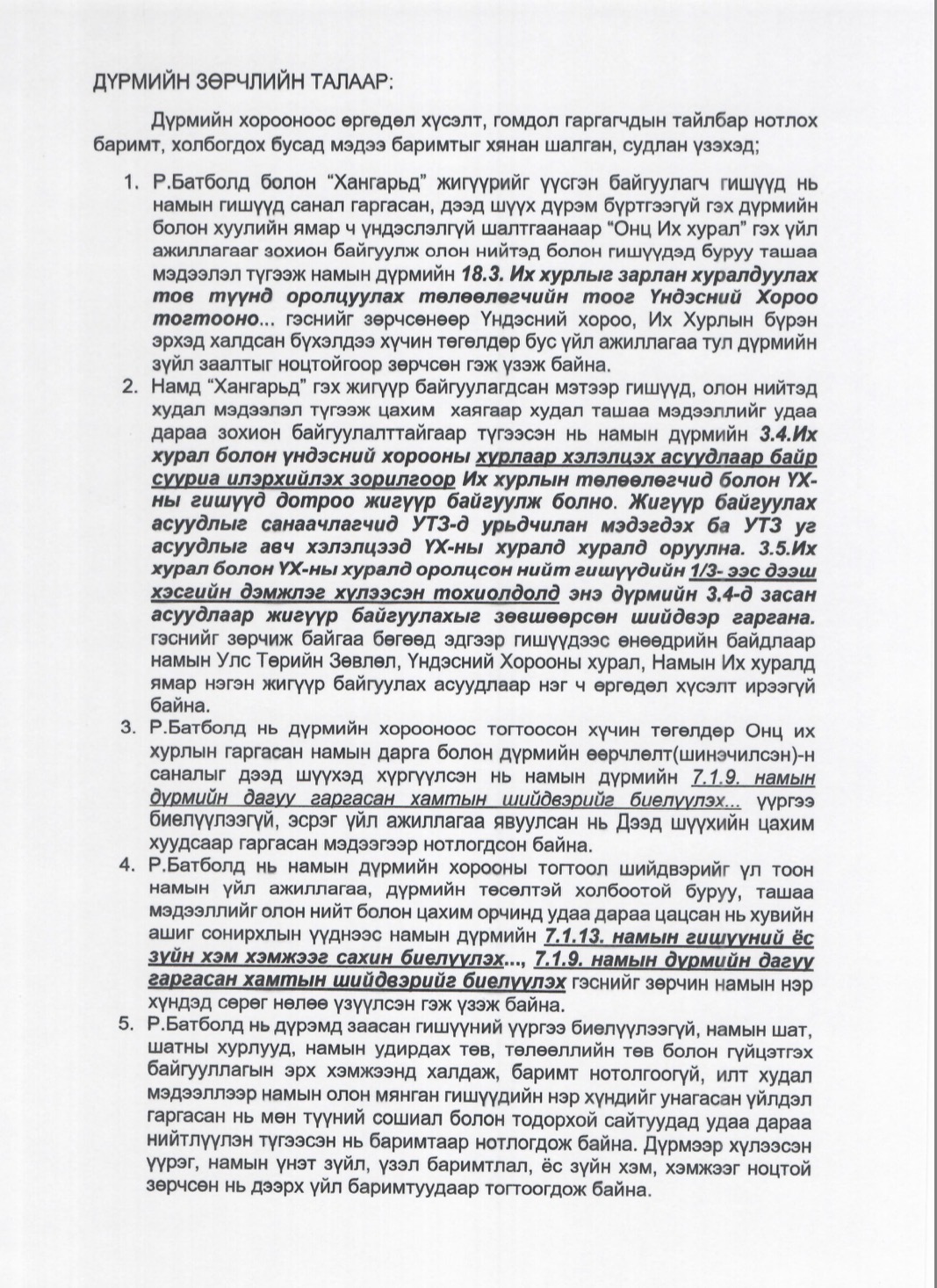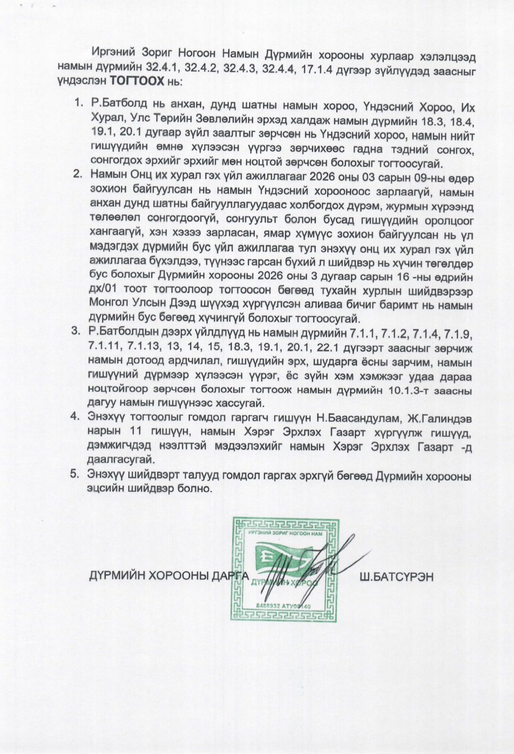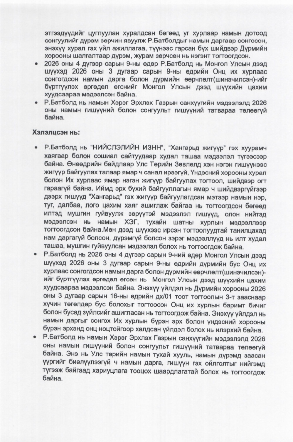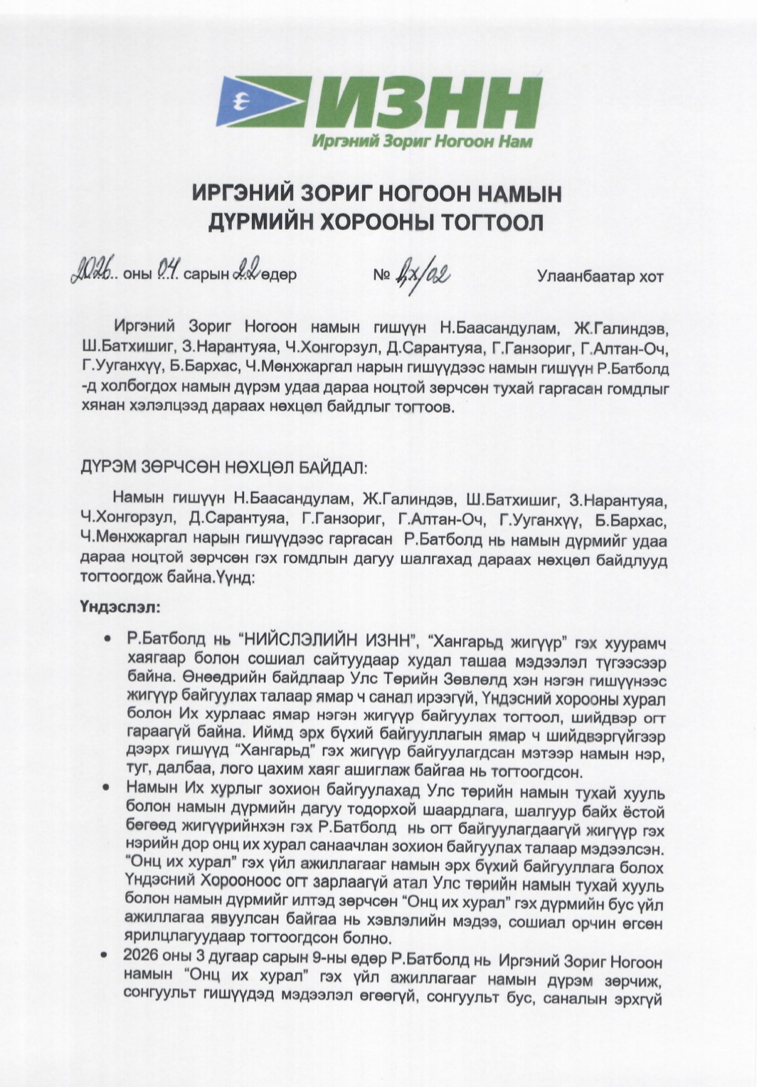 Дээрх үйлдлүүд нь намын үндсэн үнэт зүйлс болох дотоод ардчилал, ил тод байдал, хууль дээдлэх зарчмыг ноцтой зөрчсөн тул Намын дүрмийн холбогдох заалтыг үндэслэн Р.Батболдыг намын гишүүнээс хасах шийдвэр гаргалаа.