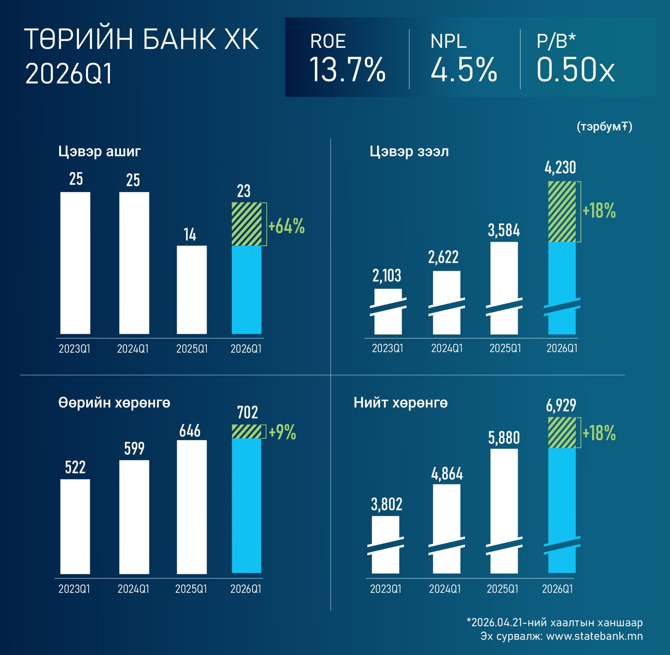 Ийнхүү 2026 оны эхний улиралд Төрийн Банк ХК ашигт ажиллагаа, активын чанар, өгөөжийн үзүүлэлтүүдээ зэрэг сайжруулсан нь банкны санхүүгийн байр суурь бэхжиж буйг харуулж байна.