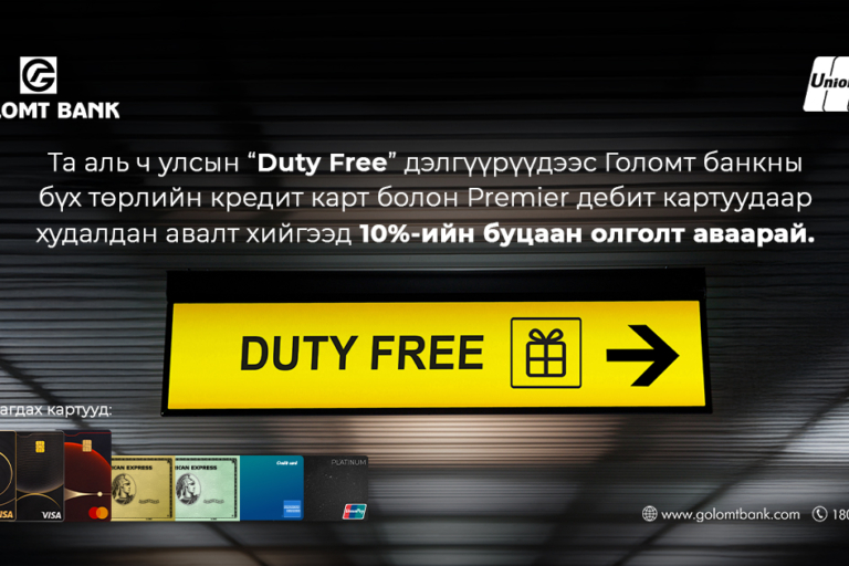 Голомт банкны картаар Duty free дэлгүүрт төлбөрөө төлөөд 10%-ийн буцаан олголт аваарай